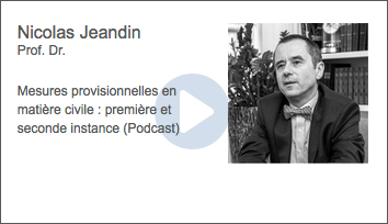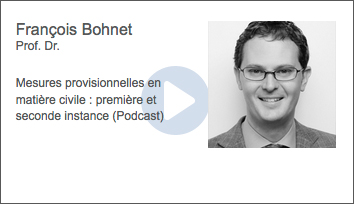 | | Podcasts | | › | François Bohnet, Mesures provisionnelles en matière civile : première et seconde instance (Podcast) | | › | Sabrina Burgat, Liquidation du régime matrimonial et contrat de séparation de biens (Podcast) | | › | Nicolas Jeandin, Mesures provisionnelles en matière civile : première et seconde instance (Podcast) | | › | Yvan Jeanneret, Les mesures provisoires en procédure pénale (Podcast) |
