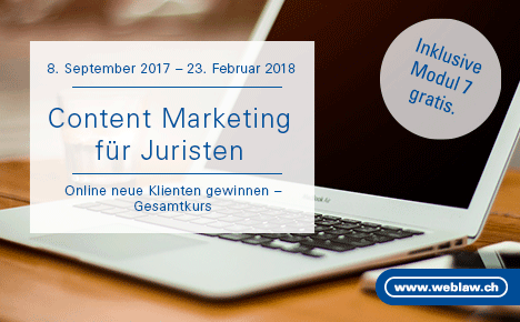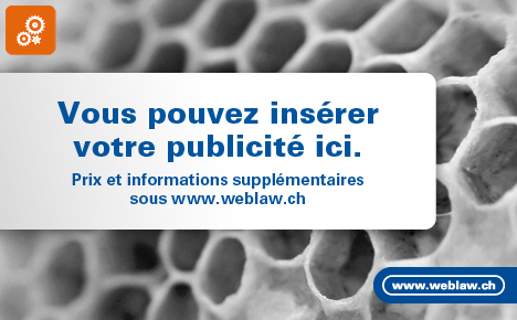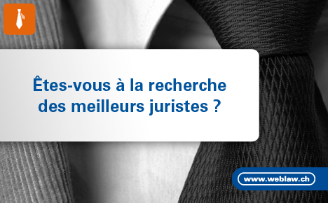 | | Annonce |  |  | | Souhaitez-vous publier votre annonce également dans Jusletter ? Lawjobs est la plus grande bourse de l'emploi juridique de Suisse. Votre annonce paraîtra durant 4 semaines sur lawjobs.ch, monster.ch und jobpilot.ch ainsi que sur Twitter. Elle sera par ailleurs envoyée pendant 4 semaines à plus de 24'000 juristes par le biais de la revue juridique en ligne Jusletter. Sur notre site Internet weblaw.ch, nous recevons chaque mois plus de 85'000 visites. Pour un meilleur placement de votre annonce, Weblaw SA propose maintenant une nouveauté : Lawjobs Special Box. Vous trouverez de plus amples informations ici. |  |  | Jusletter 4 septembre 2017 |